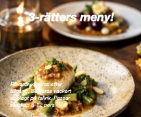 Vacker och smakrik tallriksserverad meny. Råvaror varieras efter tillgång.